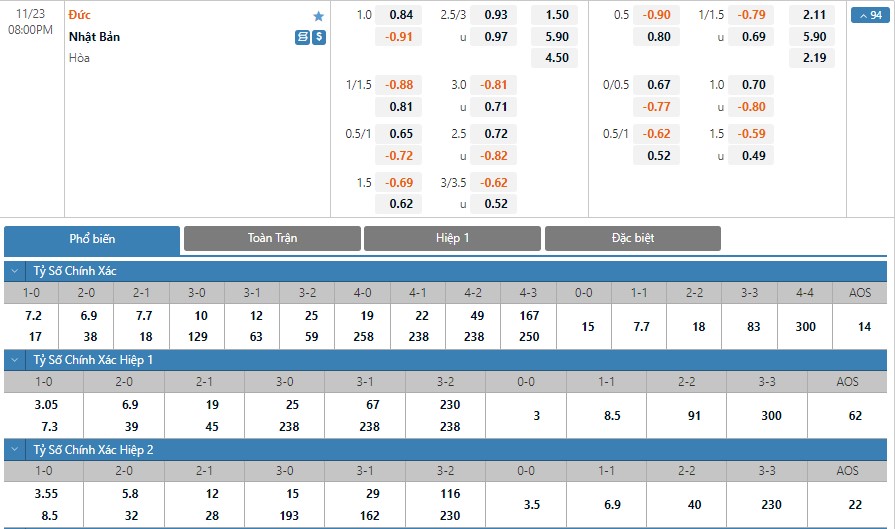 Dự đoán kèo tỷ số hiệp 1: Đức 1-0 Nhật Bản