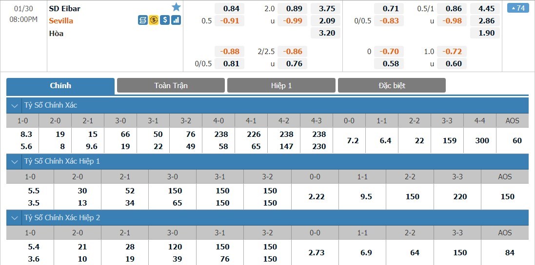 Tỷ lệ cược của Sevilla ở kèo đấu này không quấ thấp. Được đánh giá là cửa trên tuy nhiên Sevilla cũng có tỷ lệ cược lên tới 1 ăn 2.09. Eibar có tỷ lệ cược là 1 ăn 3.75 trong khi tỷ số hòa có tỷ lệ cược là 1 ăn 3.20. Đây là giai đoạn mà Sevilla đang có phong độ tốt. Đối thủ của Sevilla ở trận này cũng chỉ là một Eibar không quá đáng ngại và đội khách được dự đoán sẽ tiếp tục có 3 điểm ở trận này.