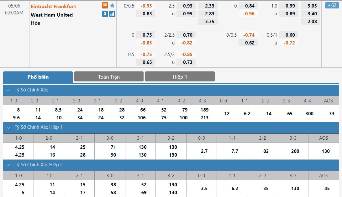 Dự đoán kèo tỷ số hiệp 1: Eintracht Frankfurt 2-0 West Ham United