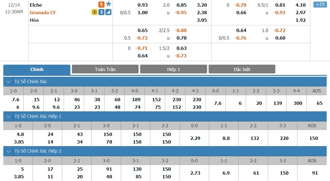 Tỷ lệ cược của 2 đội bóng ở kèo đấu này không có sự chênh lệch quá lớn. Granada phải thi đấu trên sân khách tuy nhiên họ vẫn được đánh giá là cửa trên ở kèo đấu này với tỷ lệ cược 1 ăn 2.38. Elche có tỷ lệ cược 1 ăn 3.20 trong khi tỷ số hòa có tỷ lệ cược 1 ăn 3.05. Đây là giai đoạn mà Granada đang có phong độ không cao trong khi đó Elche vẫn duy trì được một lối chơi khá khó chịu. Với lợi thế sân nhà, Elche hoàn toàn có thể sẽ tạo ra được bất ngờ và đây là kèo đấu mà người chơi có thể mạo hiểm.