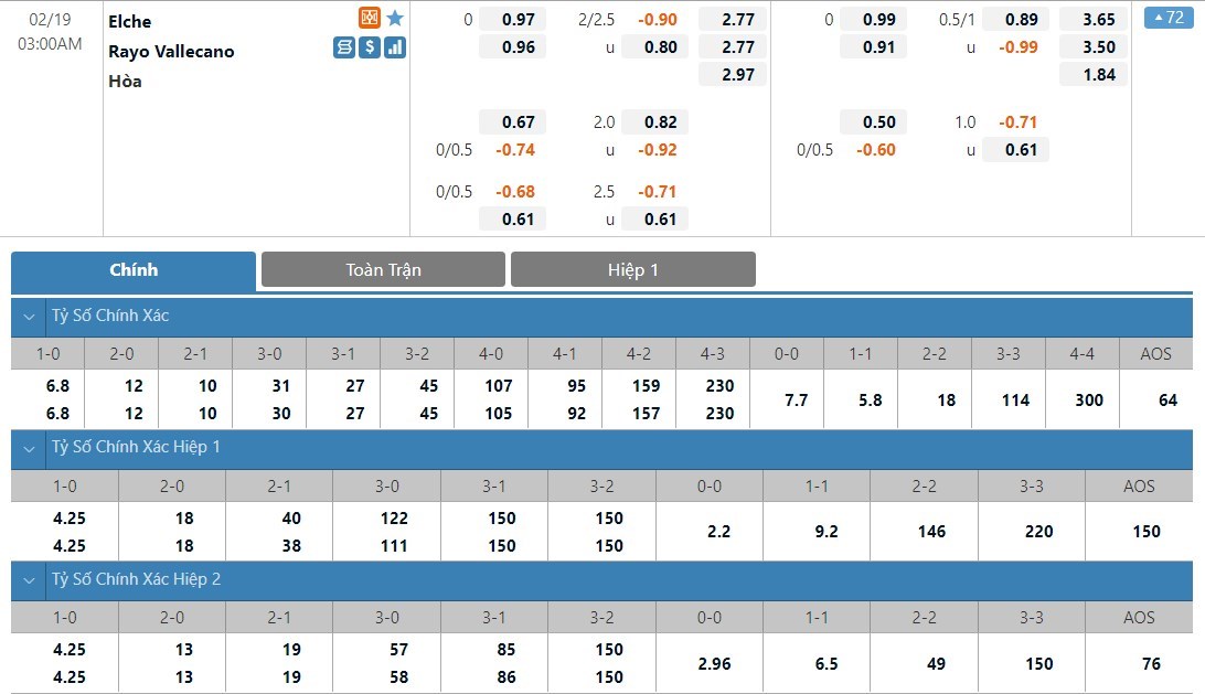 Elche và Rayo Vallecano có tỷ lệ cược cực kì cân bằng ở kèo đấu này khi cả 2 đội cũng có tỷ lệ cược là 1 ăn 2.77. Tỷ số hòa có tỷ lệ cược cao hơn đôi chút với 1 ăn 2.97. Rayo Vallecano lúc này đang rất sa sút. Trong khi đó Elche đang chơi không tệ và với lợi thế sân nhà, Elche có thể sẽ có được 1 điểm ở trận này.