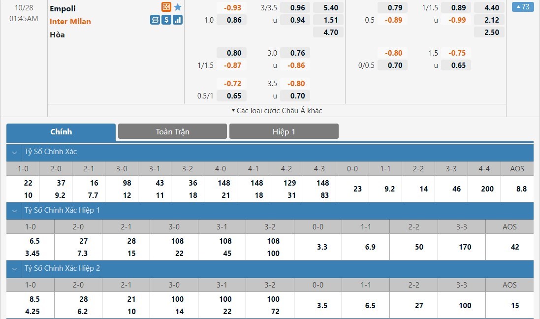 Sau 9 vòng đấu của mùa giải Serie A năm nay, Empoli đã để thủng lưới tới 18 bàn. Đội chủ nhà là cái tên thi đấu khá cởi mở và những trận đấu của họ thường xuyên xuất hiện khá nhiều bàn thắng. Hàng công của Inter Milan cũng đang chơi không tệ và trước một đối thủ thi đấu không quá chắc chắn, Inter Milan sẽ có một trận đấu thoải mái. Với tỷ lệ tài xỉu ở mức 3 1/4 trái, ô cược tài sẽ là lựa chọn cho kèo đấu này.