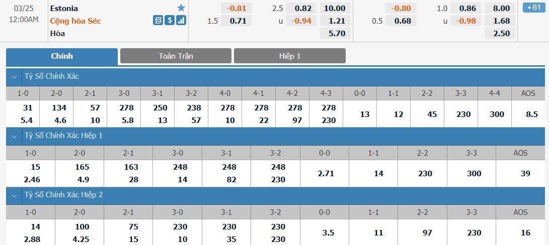 CH Séc được đánh giá cao hơn Estonia rất nhiều ở trận này. Đội khách chỉ có tỷ lệ cược là 1 ăn 1.21 trong khi đó đội chủ nhà có tỷ lệ cược lên tới 1 ăn 10.00. Tỷ số hòa có tỷ lệ cược là 1 ăn 5.70. Đây là giai đoạn mà Estonia đang có phong độ cực tệ trong khi đó CH Séc lại tỏ ra khá hiệu quả. Trước một đối thủ yếu kém, CH Séc sẽ không bỏ qua cơ hội giành được một chiến thắng.
