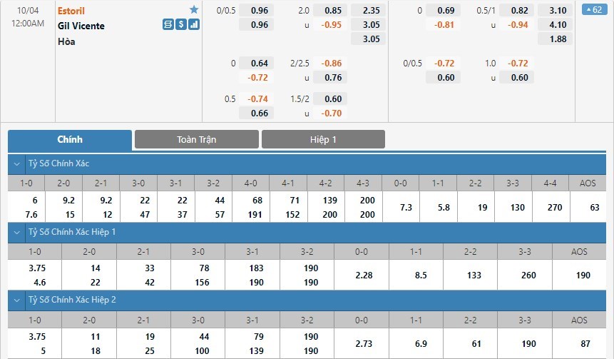 Dự đoán kèo tỷ số hiệp 1: Estoril 1-0 Gil Vicente