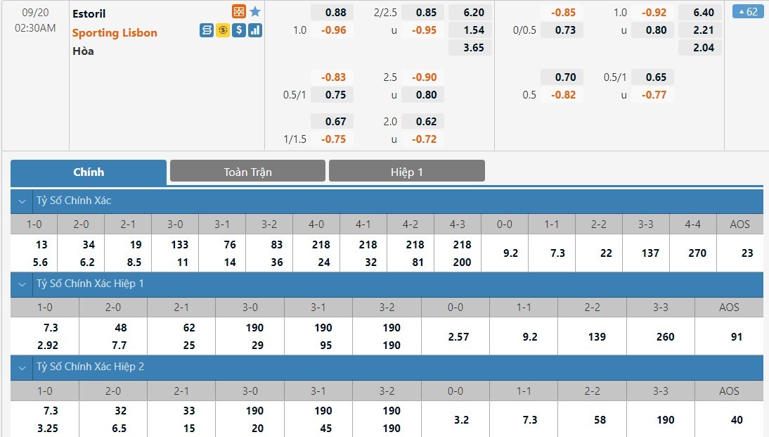 Dự đoán kèo tỷ số hiệp 1: Estoril 1-1 Sporting CP