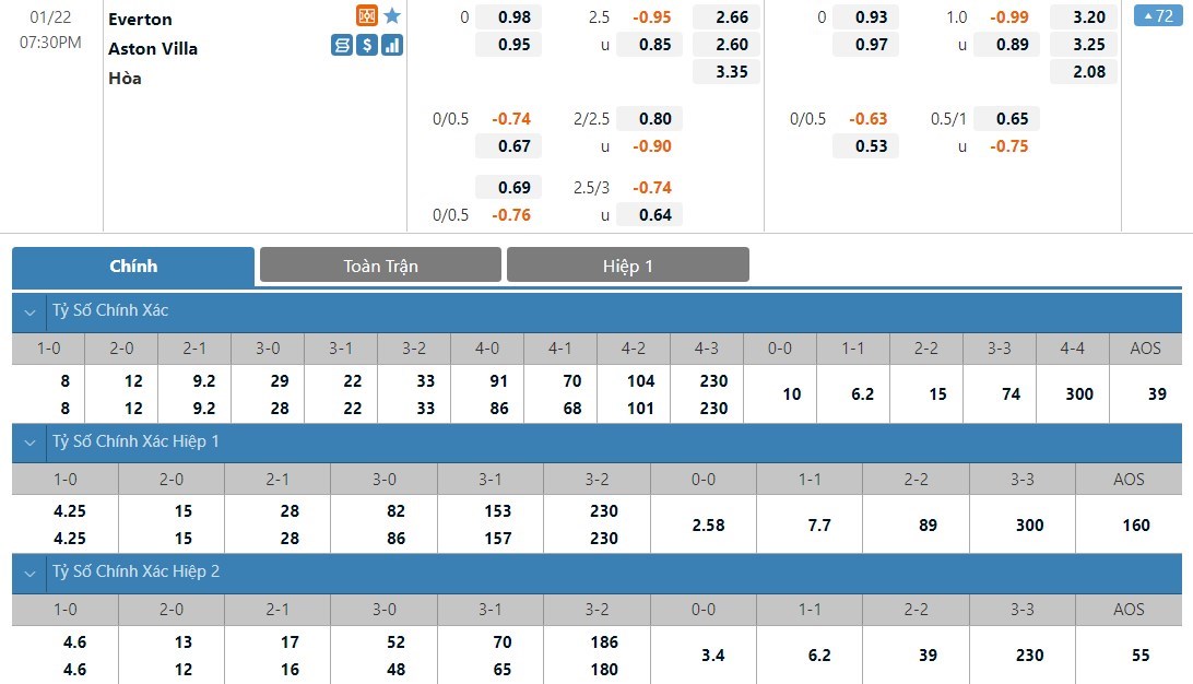 Soi kèo tổng quát Everton vs Aston Villa