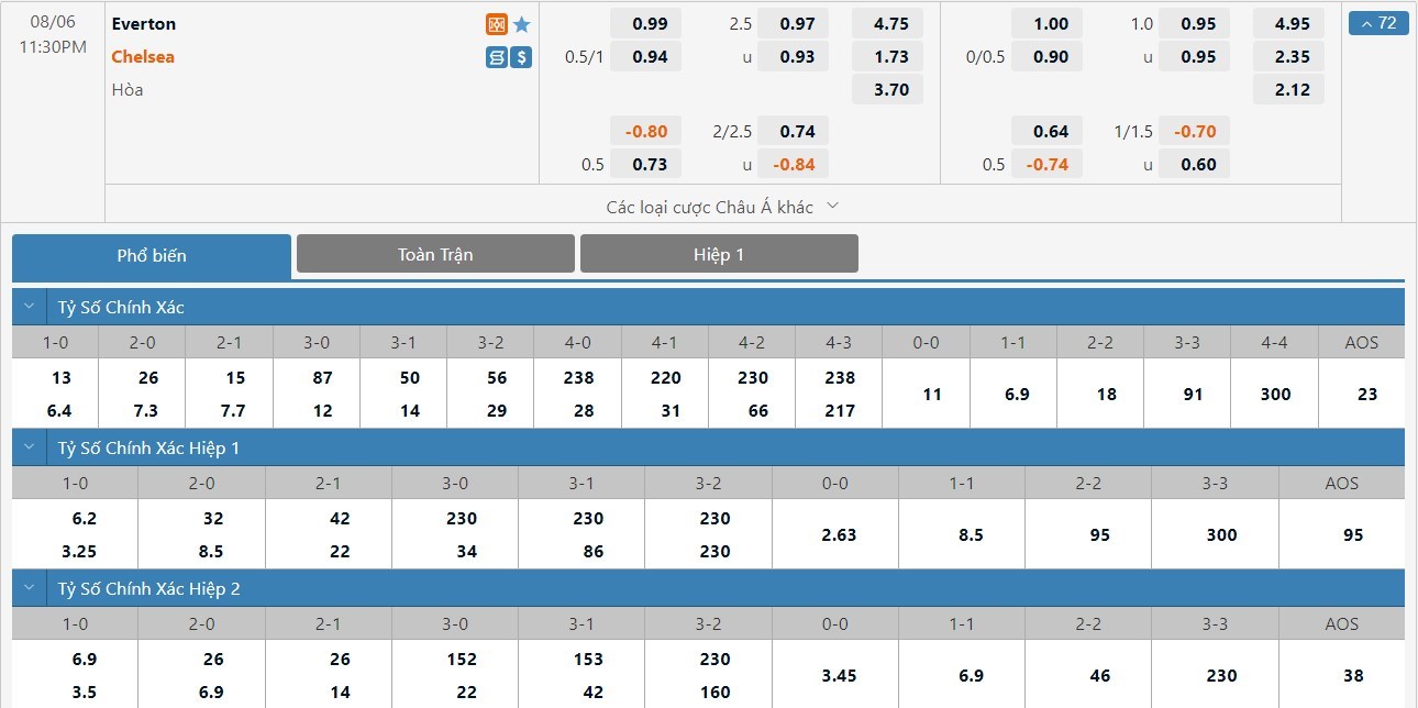 Soi kèo tài xỉu, kèo tỷ số Everton vs Chelsea