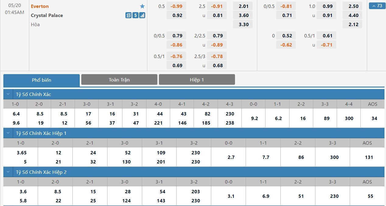 Everton là cửa trên ở trận này và kết quả họ thắng trận chỉ có tỷ lệ cược là 1 ăn 2.01. Kết quả Crystal Palace thắng trận có tỷ lệ cược là 1 ăn 3.60 trong khi đó tỷ số hòa có tỷ lệ cược là 1 ăn 3.30. Everton lúc này vẫn đang gặp rất nhiều vấn đề và họ vẫn đang tỏ ra rất thiếu ổn định. Trong khi đó Crystal Palace vẫn đang cho thấy một lối chơi rất khó chịu và họ đang có phong độ tốt. Trước một đội chủ nhà vừa sức, Crystal Palace sẽ kiếm được 1 điểm ở trận này.