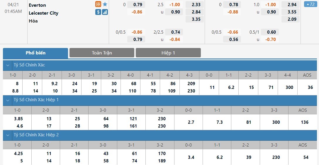 Everton và Leicester được đánh giá rất ngang ngửa ở trận này. Kết quả Everton thắng trận có tỷ lệ cược là 1 ăn 2.33 trong khi đó kết quả Leicester thắng trận có tỷ lệ cược là 1 ăn 2.84. Tỷ số hòa có tỷ lệ cược là 1 ăn 3.35. Leicester vẫn đang tỏ ra chưa quá ổn định. Làm khách trước một Everton đang thi đấu không tệ và rất khát điểm, Leicester nhiều khả năng sẽ phải nhận thêm một thất bại.