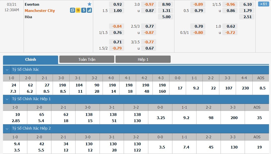 Man City được đánh giá cao hơn Everton khá nhiều ở trận này dù họ là đội phải làm khách. Tỷ lệ cược của Man City chỉ là 1 ăn 1.31 trong khi đó Everton có tỷ lệ cược lên tới 1 ăn 8.90. Tỷ số hòa có tỷ lệ cược là 1 ăn 5.00. Man City vẫn đang thi đấu cực kì hiệu quả trong khi đó đây là lúc mà Everton có phong độ không tốt. Sẽ là quá khó để Everton có thể tạo ra được bất ngờ ở trận này và đây là kèo đấu mà người chơi nên lựa chọn cửa trên an toàn.