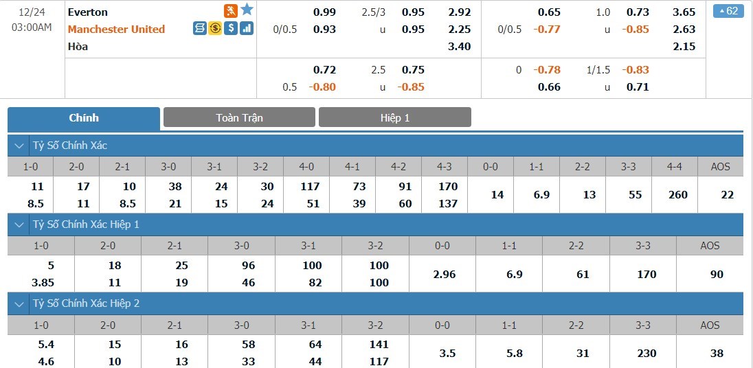 Soi kèo tài xỉu, kèo tỷ số Everton vs Manchester United