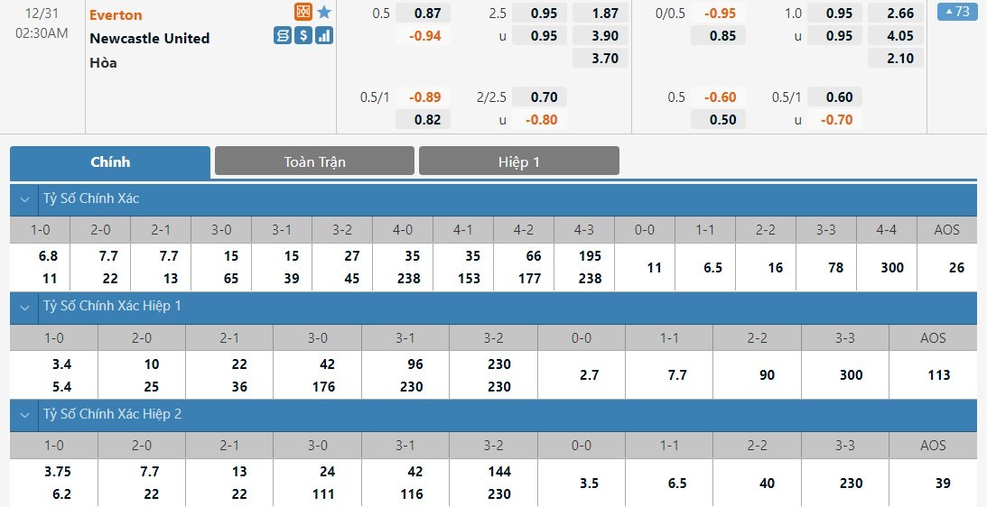 Everton vẫn sẽ được đánh giá cao hơn Newcastle không ít ở trận này. Tỷ lệ cược của Everton chỉ là 1 ăn 1.87 trong khi đó Newcastle có tỷ lệ cược là 1 ăn 3.90. Tỷ số hòa có tỷ lệ cược là 1 ăn 3.70. Everton lúc này vẫn đang thi đấu khá tệ và có thể tin tưởng Newcastle sẽ kiếm được 1 điểm ở trận này.