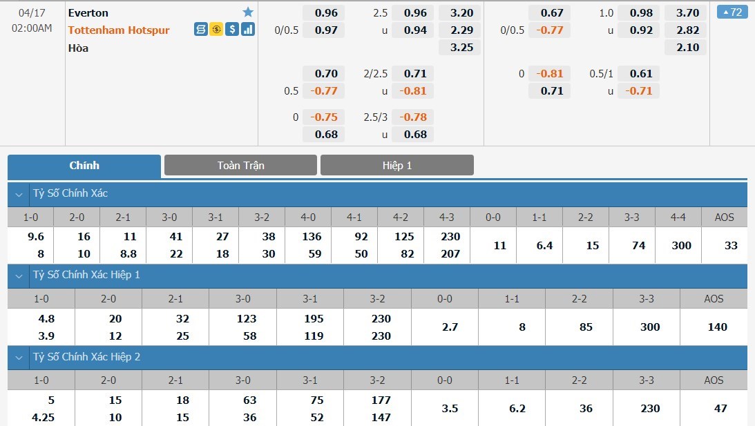 Tottenham vẫn được đánh giá cao hơn đôi chút so với Everton ở trận này dù họ phải làm khách. Tỷ lệ cược của Tottenham là 1 ăn 2.29 trong khi đó Everton có tỷ lệ cược là 1 ăn 3.20. Tỷ số hòa có tỷ lệ cược là 1 ăn 3.25. Tottenham lúc này đang có phong độ khá tệ. Phải làm khách trước một Everton có thực lực tốt, Tottenham sẽ không dễ thắng và nhiều khả năng hai đội sẽ cầm hòa nhau ở trận này.