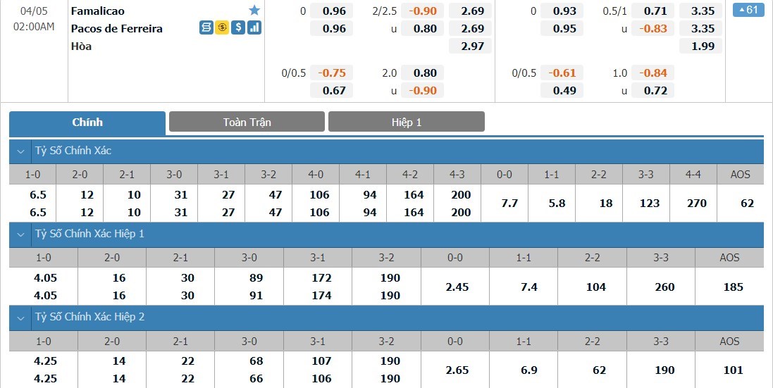 Cả Famalicao và Pacos de Ferreira đều có tỷ lệ cược ở mức 1 ăn 2.69 ở trận này. Tỷ số hòa có tỷ lệ cược cao hơn đôi chút với 1 ăn 2.97. Pacos de Ferreira đang thi đấu hiệu quả ở mùa giải năm nay và so với Famalicao, Pacos de Ferreira đang tỏ ra nhỉnh hơn. Ở kèo đấu này, cửa cược Pacos de Ferreira sẽ là lựa chọn không quá tệ.