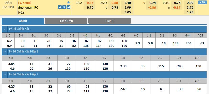 Dự đoán kèo tỷ số hiệp 1: FC Seoul 1-0 Seongnam FC