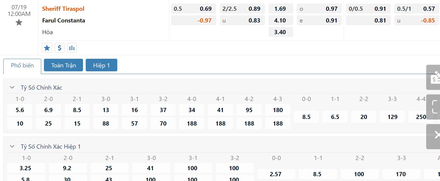 Soi kèo tài xỉu, kèo tỷ số FC Sheriff vs Farul Constanta