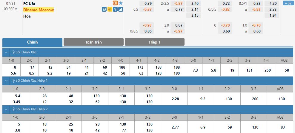 Dự đoán kèo tỷ số hiệp 1: FC Ufa 0-1 Dinamo Moscow