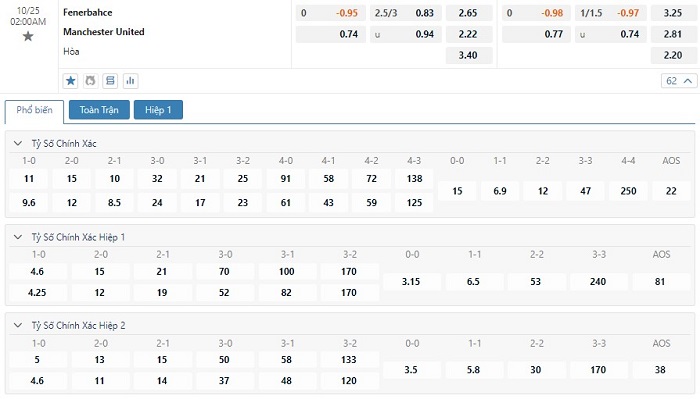 Soi kèo tài xỉu, kèo tỷ số Fenerbahce vs Man United