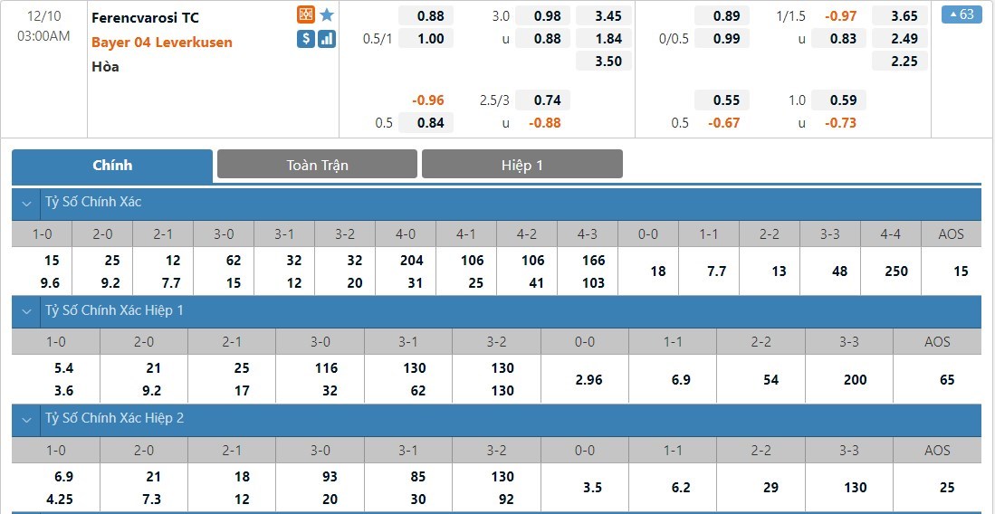 Dự đoán kèo tỷ số hiệp 1: Ferencvarosi 1-1 Bayer Leverkusen
