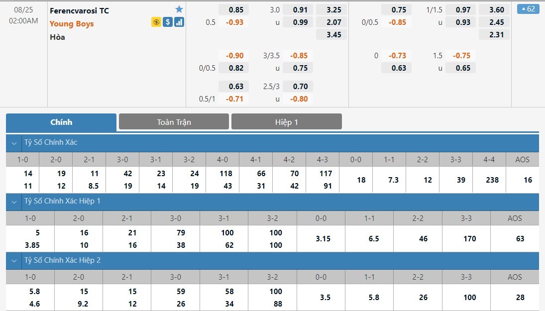 Trong 3 trận gần nhất của mình, Young Boys ghi được tới 10 bàn trong khi đó Ferencvarosi có 6 bàn. Đây là lúc mà hàng công của cả Ferencvarosi và Young Boys đều đang thi đấu rất hiệu quả và ô cược tài là lựa chọn có thể tin tưởng ở kèo đấu này.