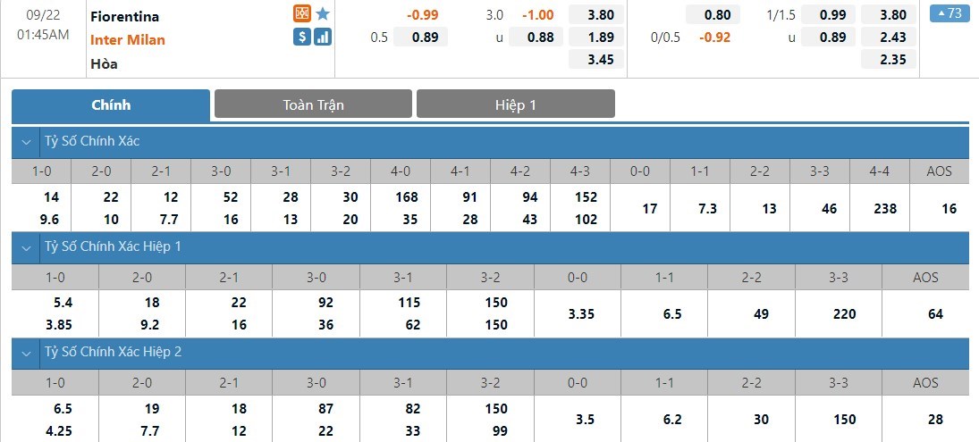 Dự đoán kèo tỷ số hiệp 1: Fiorentina 1-1 Inter Milan