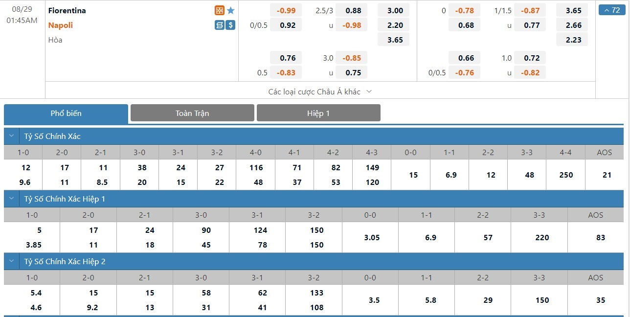 Dự đoán kèo tỷ số hiệp 1: Fiorentina 0-2 Napoli
