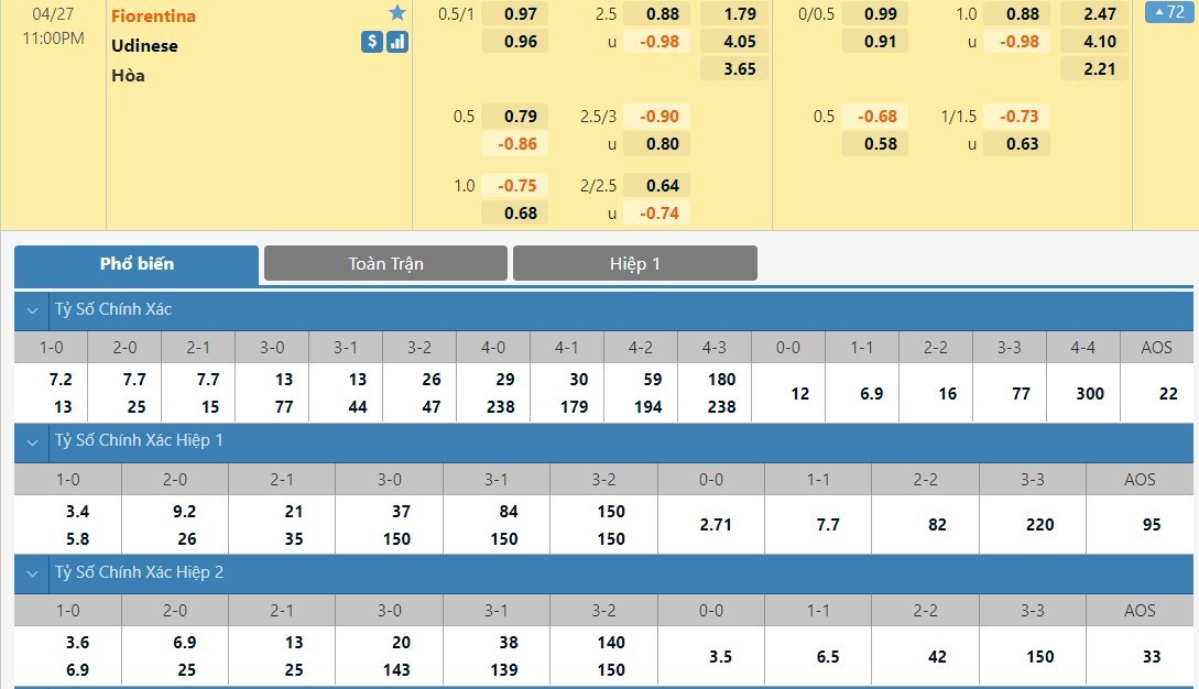Soi kèo tài xỉu, kèo tỷ số Fiorentina vs Udinese