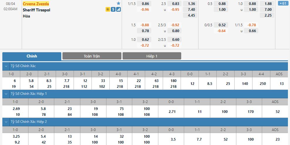 Kèo châu Âu hiệp 1: FK Crvena Zvezda