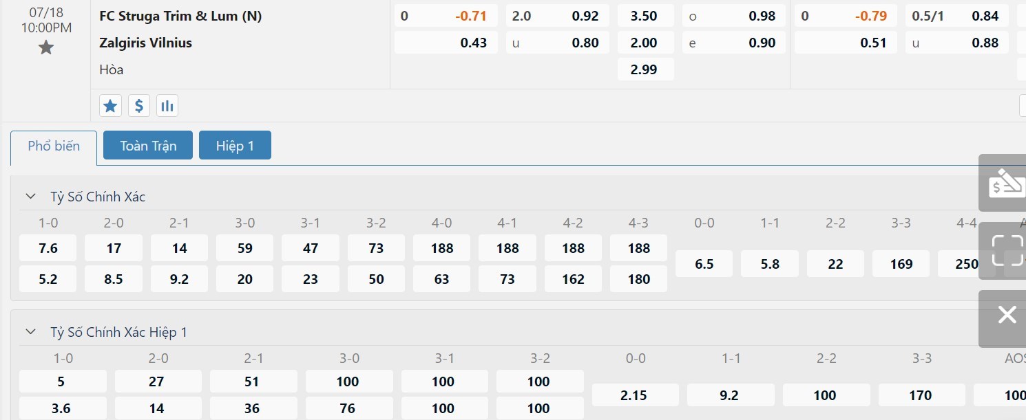 Dự đoán kèo tỷ số hiệp 1: FK Struga 0-0 Zalgiris Vilnius