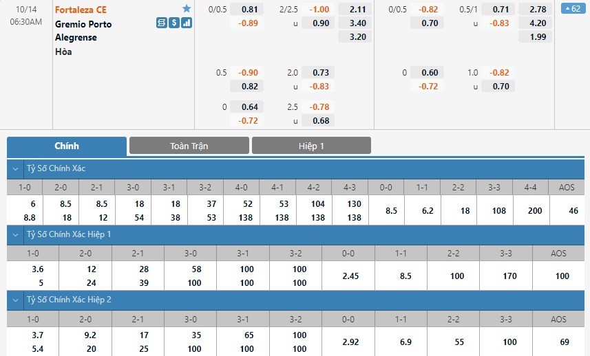 Dự đoán kèo tỷ số hiệp 1: Fortaleza 1-0 Gremio
