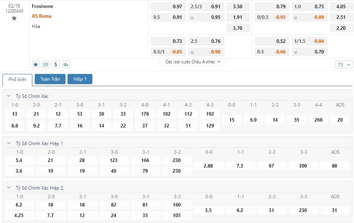 Dự đoán kèo tỷ số hiệp 1: Frosinone 0-1 AS Roma