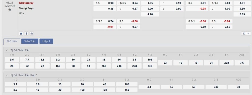 Dự đoán kèo tỷ số hiệp 1: Galatasaray 1-0 Young Boys