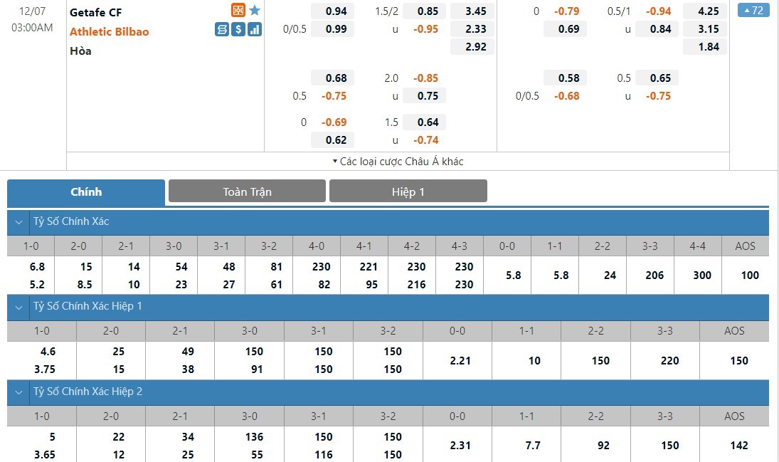 Dự đoán kèo tỷ số hiệp 1: Getafe 1-0 Athletic Bilbao