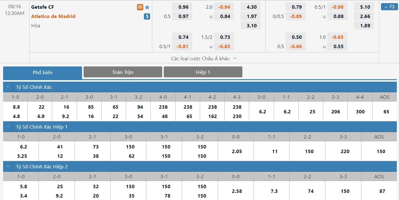 Dự đoán kèo tỷ số hiệp 1: Getafe 0-1 Atletico Madrid