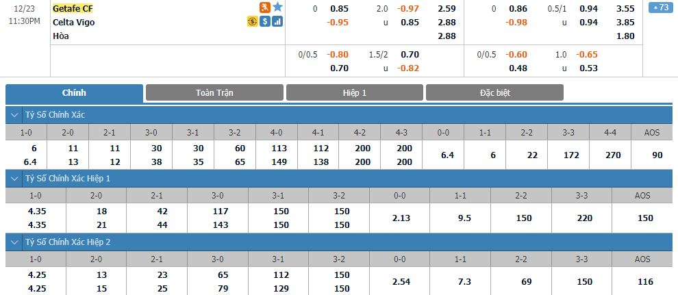 Dự đoán kèo tỷ số hiệp 1: Getafe 0-2 Celta Vigo