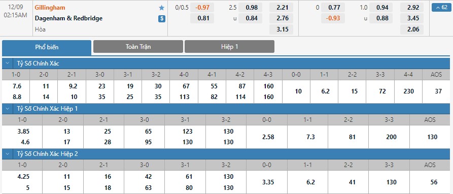 Dự đoán kèo tỷ số hiệp 1: Gillingham 0-2 Dagenham and Redbridge