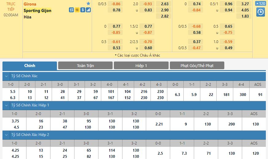 Dự đoán kèo tỷ số hiệp 1: Girona 1-0 Sporting Gijon
