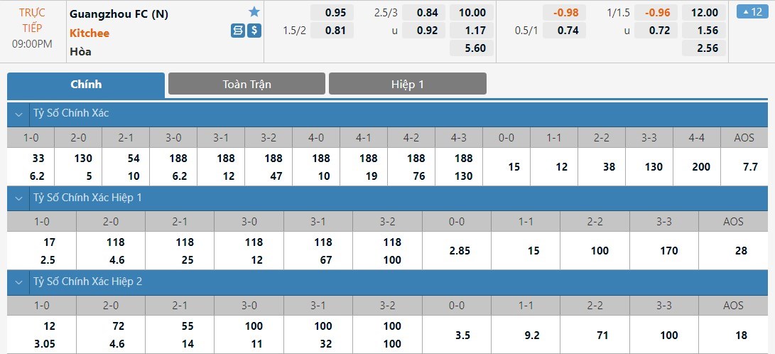 Dự đoán kèo tỷ số hiệp 1: Guangzhou FC 0-2 Kitchee