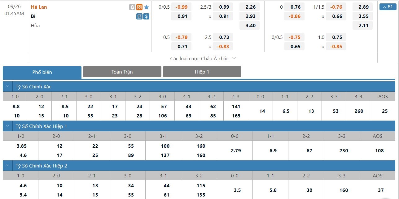 Soi kèo châu Á Hà Lan vs Bỉ