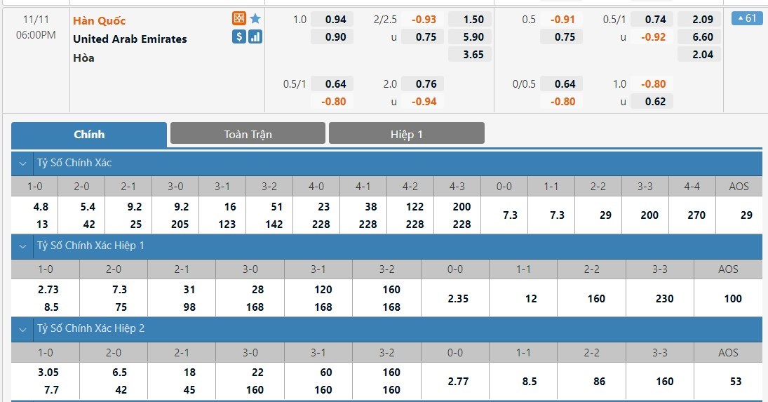 Dự đoán kèo tỷ số hiệp 1: Hàn Quốc 1-0 UAE