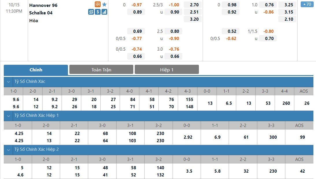 Hannover và Schalke sẽ có tỷ lệ cược khá cân bằng ở kèo đấu này. Tỷ lệ cược của Hannover là 1 ăn 2.70 trong khi đó Schalke có tỷ lệ cược thấp hơn đôi chút với 1 ăn 2.51. Tỷ số hòa có tỷ lệ cược là 1 ăn 3.20. Schalke lúc này đang có phong độ cao. Trong khi đó Hannover vẫn đang tỏ ra rất sa sút ở mùa giải năm nay và với kèo đấu này, Schalke được dự đoán sẽ thi đấu lấn lướt đối thủ để giành 1 chiến thắng.