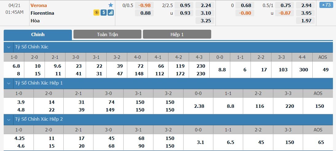 Dự đoán kèo tỷ số hiệp 1: Hellas Verona 0-1 Fiorentina
