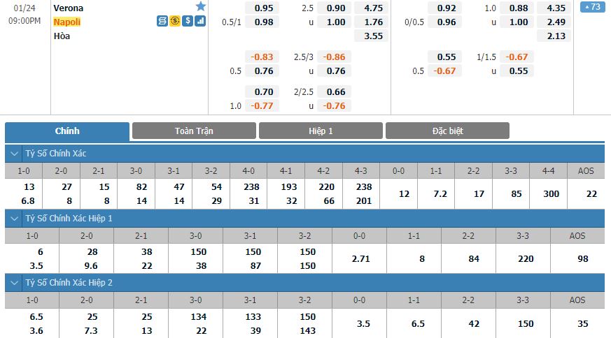 Dự đoán kèo tỷ số hiệp 1: Hellas Verona 0-2 Napoli