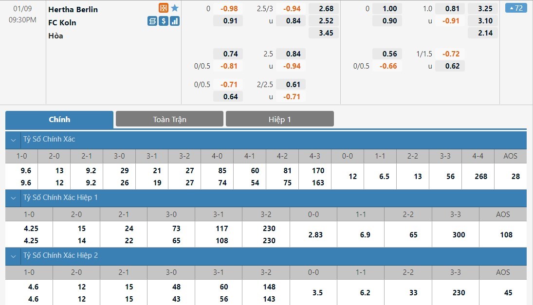 Dự đoán kèo tỷ số hiệp 1: Hertha Berlin 0-0 Koln