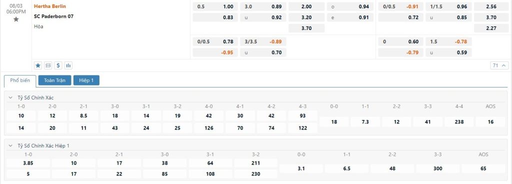 Dự đoán kèo tỷ số hiệp 1: Hertha Berlin 1-1 Paderborn