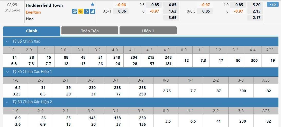 Dự đoán kèo tỷ số hiệp 1: Huddersfield Town 0-2 Everton
