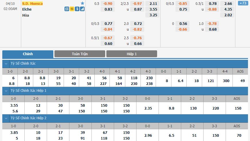Dự đoán kèo tỷ số hiệp 1: Huesca 1-0 Elche