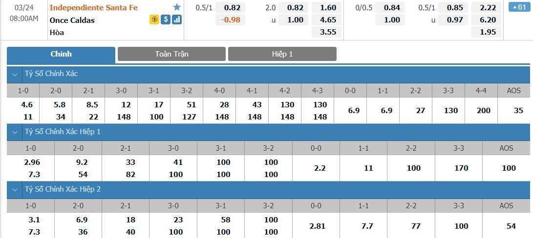 Santa Fe được đánh giá cao hơn Once Caldas khá nhiều ở kèo đấu này. Tỷ lệ cược của Santa Fe chỉ là 1 ăn 1.60 trong khi đó Once Caldas có tỷ lệ cược lên tới 1 ăn 4.65. Tỷ số hòa có tỷ lệ cược là 1 ăn 3.55. Once Caldas thi đấu khá khó chịu ở những vòng đấu vừa qua và đây là 1 trận đấu ẩn chứa nhiều rủi ro cho Santa Fe. Có cơ sở để người chơi có thể mạo hiểm với ô cược hòa ở trận này.