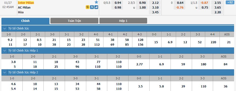 Soi kèo tài xỉu, kèo tỷ số Inter Milan vs AC Milan