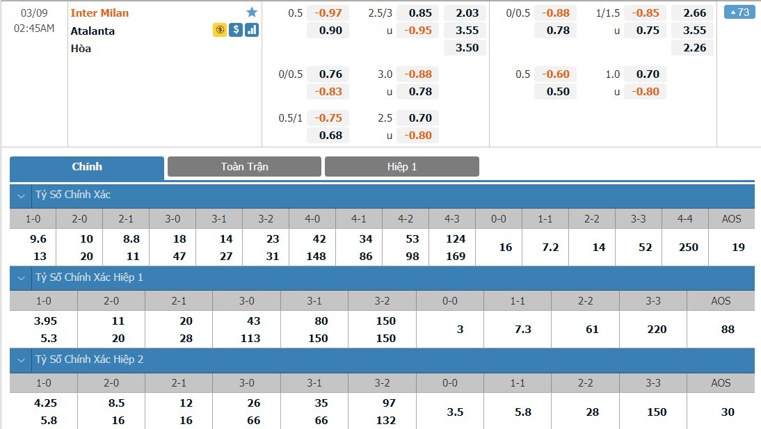 Inter Milan được đánh giá là cửa trên ở trận đấu này với tỷ lệ cược 1 ăn 2.03. Atalanta có tỷ lệ cược lên tới 1 ăn 3.55 trong khi đó tỷ số hòa có tỷ lệ cược là 1 ăn 3.50. Atalanta đang có phong độ rất cao và với thực lực tốt của mình, họ hoàn toàn có thể làm khó được Inter. Có cơ sở để người chơi có thể mạo hiểm với ô cược hòa ở kèo đấu này.